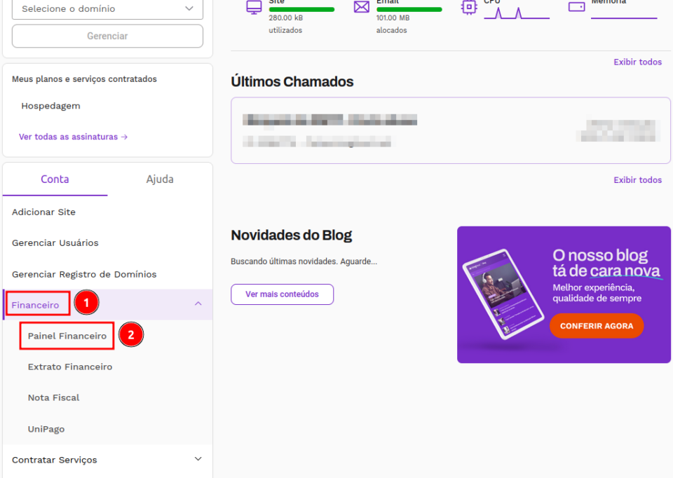 Acesse o painel de sua hospedagem, do lado esquerdo do Painel, na aba Conta, clique em “Financeiro” e depois na opção “Painel Financeiro“.