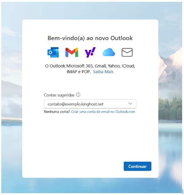 Caso seja a configuração inicial de uma conta do Outlook New, você terá um campo ao centro da tela pedindo a conta de e-mail Kinghost.