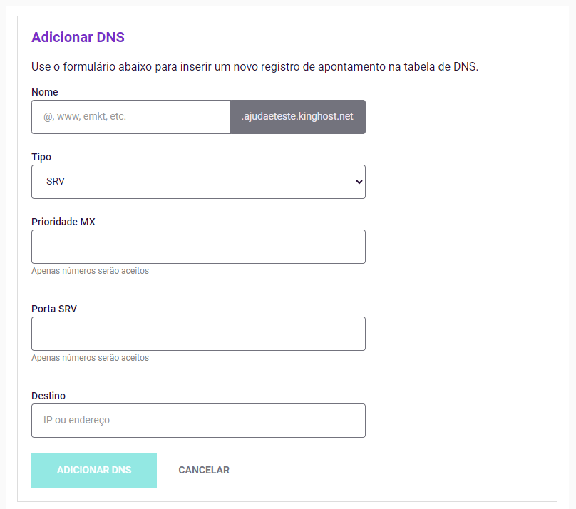 Você pode configurar sua entrada SRV diretamente no painel de controle, desde que seus servidores DNS estejam apontados para a KingHost. É importante realizar esse procedimento com cuidado!