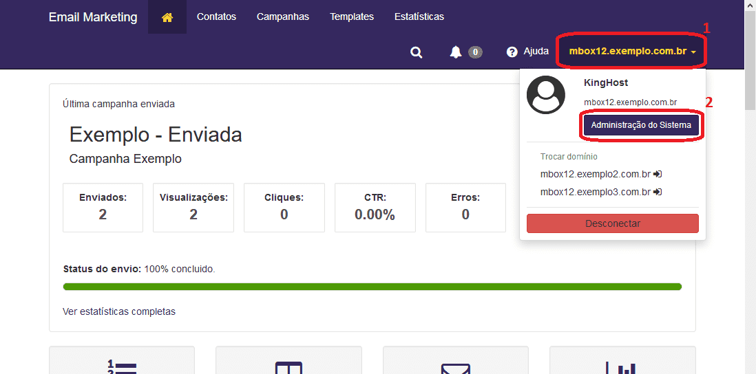 Acesse o seu painel administrativo do Email Marketing, clique em mbox12.[seudomínio] e após em Administração do Sistema: