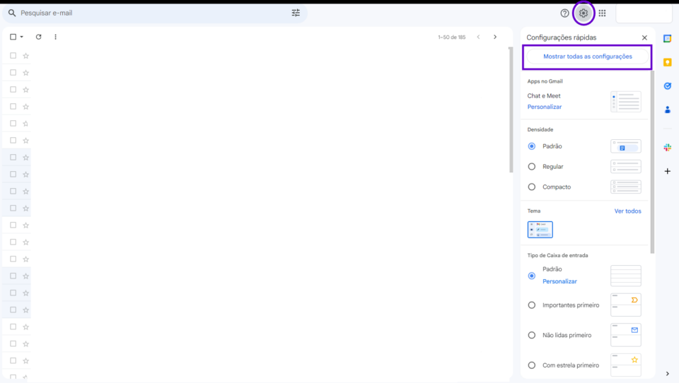 No canto superior direito da tela, clique no ícone de engrenagem.