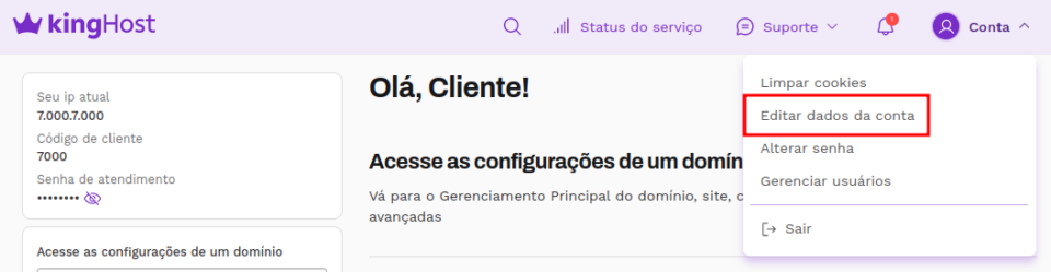 1 Acesse nosso painel de controle. No topo direito do painel, clique em cima do seu nome e depois em Editar dados da conta.