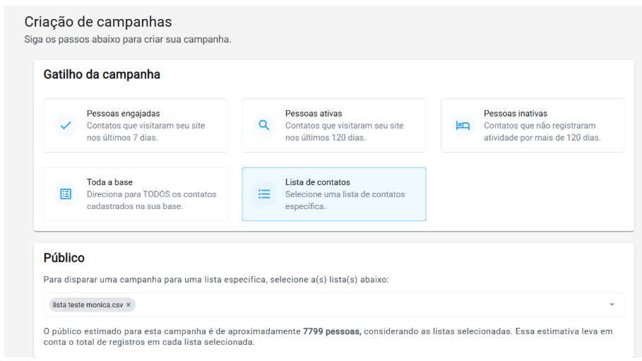 - Para cada campanha, o sistema exibe uma estimativa do público-alvo com base nas listas selecionadas.