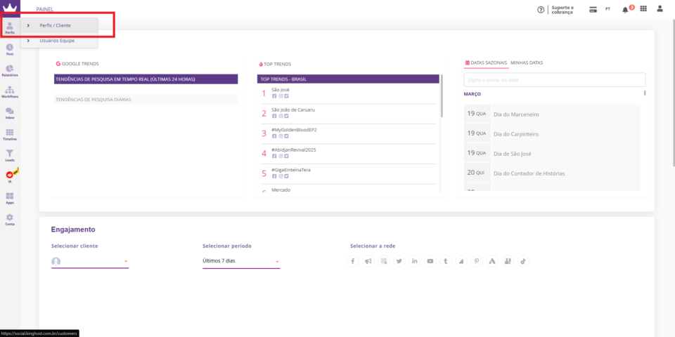 2 – Em seu painel, clique em Perfis > Perfis/Clientes.