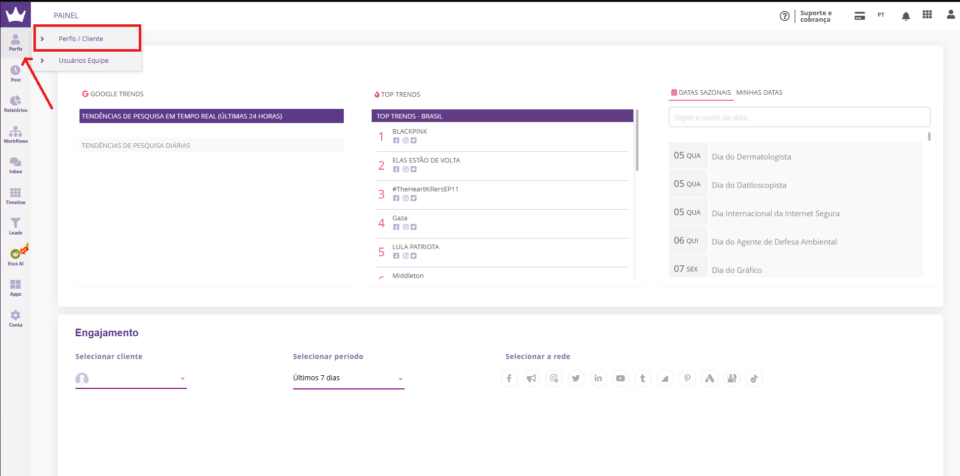 1. Na dashboard da Etus, vá para a página “Perfil” > “Perfil/Cliente”.