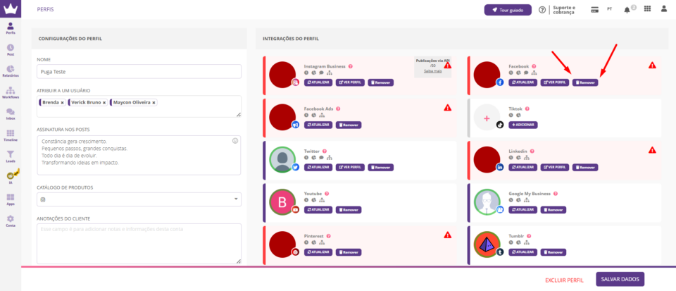 5. Ao entrar na página do perfil, clique no botão “Remover” referente a página do Facebook e depois clique em “Adicionar”.