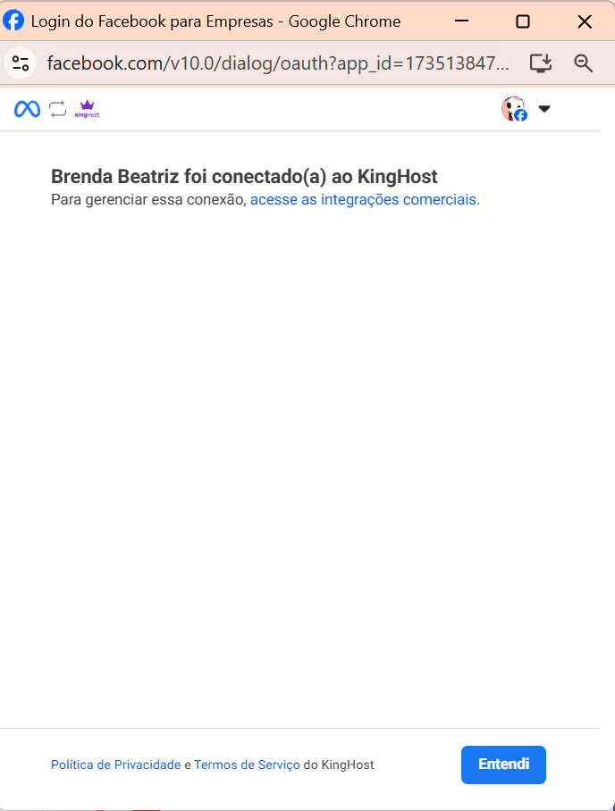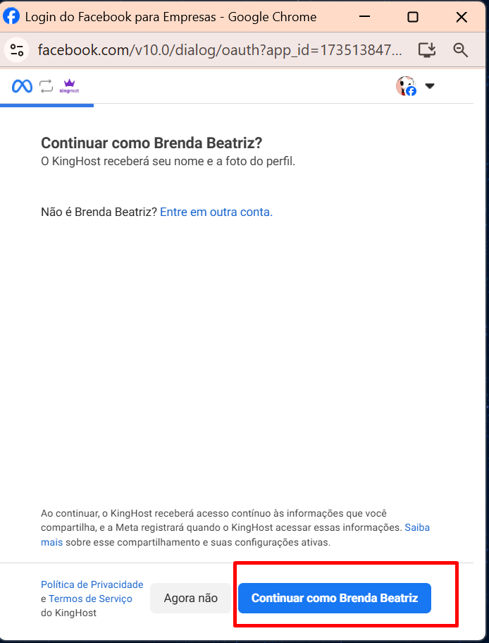 6. Será exibido o pop-up de conexão do Facebook, Clique em “Continuar como…”.