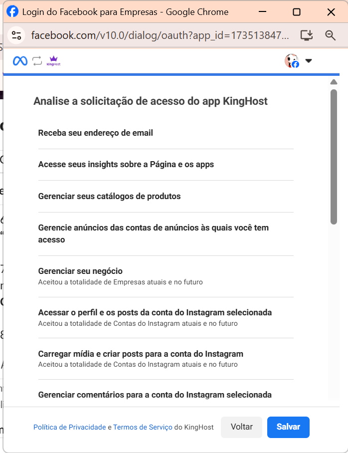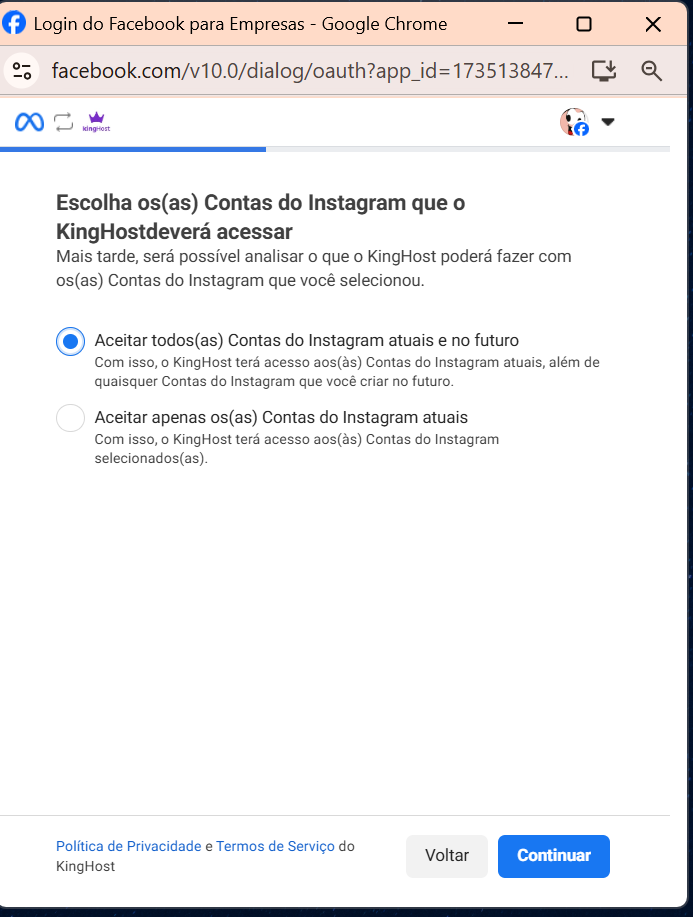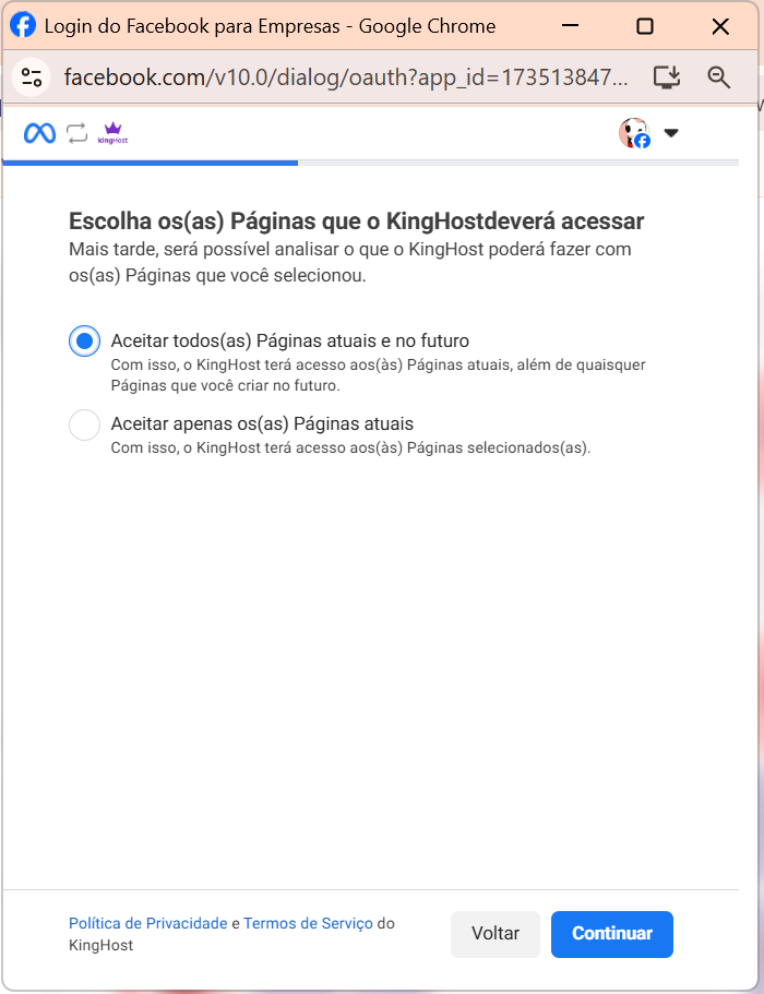 7. É importante deixar sempre selecionada a opção “TODAS” nas 3 etapas de permissões apresentadas (Páginas, Empresas e Contas do Instagram).