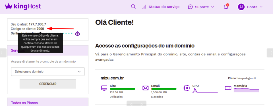 Acesse o Painel de Controle KingHost. Logo de início, atente seu olhar para o lado esquerdo do painel, onde você pode encontrar uma caixa de informações, seu código estará dentro.