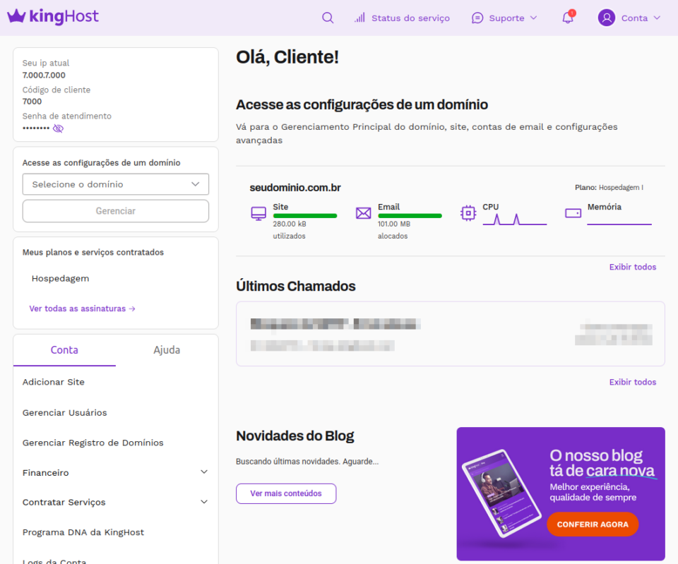 Após realizar login no Painel de Controle KingHost, você irá se deparar com a seguinte página: