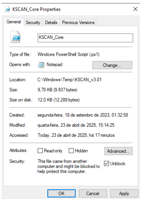 - Clique com o botão direito do mouse no arquivo KSCAN_Core.ps1 e vá em propriedades.